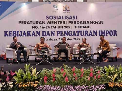 Sekitar 400 lebih pengusaha dari berbagai sektor industri di Jawa Timur menghadiri kegiatan Sosialisasi Permendag Nomor 16-24 Tahun 2025 tentang Kebijakan dan Pengaturan Impor. Acara yang digelar di Hotel Sheraton Surabaya pada Kamis (7/8), merupakan bentuk kolaborasi antara Kementerian Perdagangan (Kemendag) dan Kamar Dagang dan Industri (Kadin) Jawa Timur.