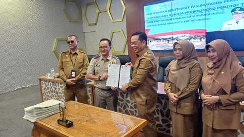 Penyerahan sertifikat fasum dan fasos periode 2023-2025 tersebut diterima langsung oleh Wali Kota Probolinggo dr. Aminuddin dari Kepala Kantor Pertanahan (BPN) Kota Probolinggo, Siswoyo, disaksikan jajaran perangkat daerah terkait.