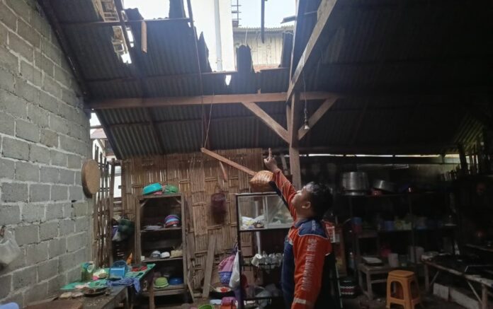 Rumah salah seorang warga Desa Waung tampak atapnya berlubang setelah diterjang angin puting beliung, Sabtu (12/6) sore.