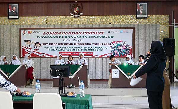 Menyemarakkan Hari Ulang Tahun RI ke-80, Kodim 0813 Bojonegoro bekerja sama dengan Dinas Pendidikan Kabupaten Bojonegoro menyelenggarakan Lomba Cerdas Cermat (LCC) Wawasan Kebangsaan jenjang Sekolah Dasar se-Kabupaten Bojonegoro.