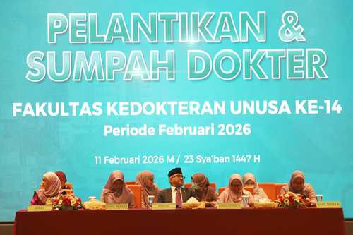 Dekan FK Unusa, Dr. Handayani, dr., M.Kes, mengatakan 46 lulusan dokter itu terdiri atas peserta yang lulus Uji Kompetensi Mahasiswa Program Profesi Dokter (UKMPPD) periode Agustus dan November 2025. “Sebelum menjalani program internsip, para lulusan diwajibkan mengikuti sumpah dan pelantikan dokter sebagai bagian dari tahapan profesi,” jelasnya.