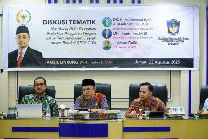 Wakil Ketua Dewan Perwakilan Daerah (DPD) RI, Tamsil Linrung, menegaskan pentingnya paket insentif municipal bond sebagai stimulus agar pemerintah daerah berani menerbitkan obligasi. Hal itu disampaikan dalam Diskusi Tematik bertajuk “Membaca Arah Arsitektur Anggaran Negara untuk Pembangunan Daerah dalam Bingkai Asta Cita” yang digelar DPD RI bekerjasama dengan Fakultas Ekonomi dan Bisnis Universitas Muslim Indonesia (UMI), Makassar.