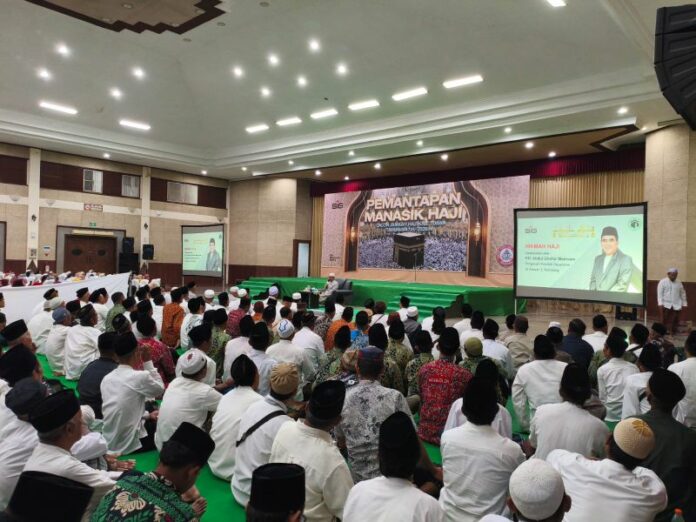 Para colon jamaah haji asal kabupaten Tuban saat mengikuti bimbingan pemantapan manasik haji yang diadakan kemenangan bersama PT SIG diGedung Graha Sandiya, Desa Bogorejo, Kecamatan Merakurak, Kabupaten Tuban,