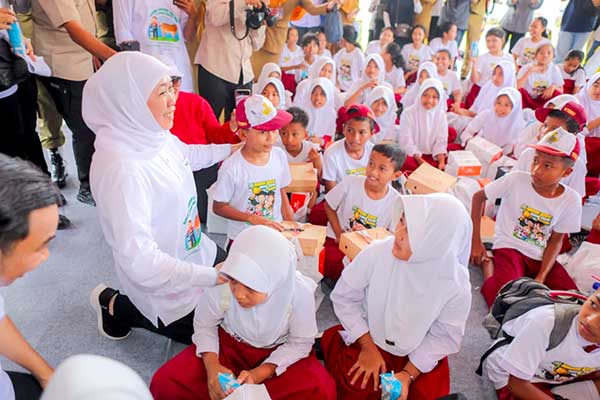 Didampingi Bupati Jember Muhammad Fawait, Gubernur Khofifah menghampiri anak-anak yang duduk lesehan sambil memegang susu kemasan produksi salah satu produsen dalam negeri. Tawa dan sorak spontan pecah saat Gubernur Khofifah mengajak mereka minum susu bersama-sama.