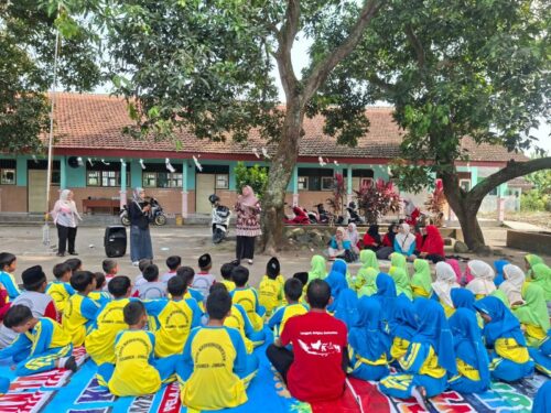 Usai senam, para murid duduk santai di bawah pepohonan rindang halaman sekolah. Mereka mendapat kunjungan dari pihak MBG yang mengajak berbincang santai lewat sesi “request menu” untuk mengetahui makanan favorit adik-adik.