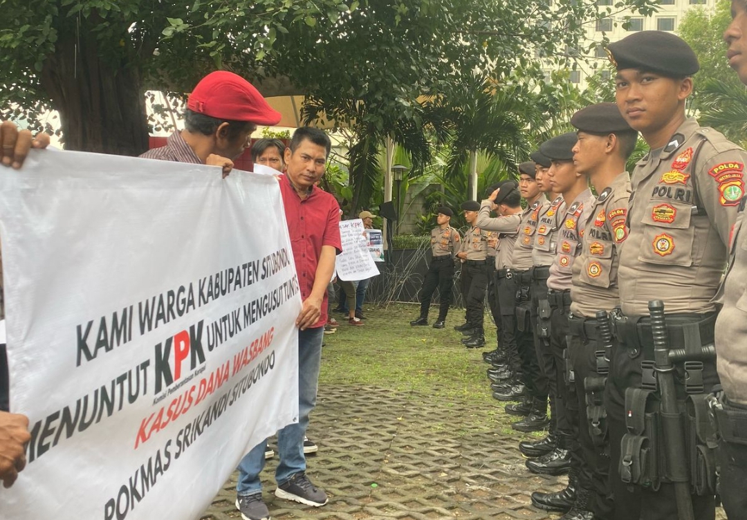 Aktivis Aliansi Masyarakat Anti Korupsi Indonesia (AMAKI) Kabupaten Situbondo melakukan aksi demonstrasi di depan Gedung Merah Putih KPK, Senin (17/3). Aksi itu digelar untuk mendesak lembaga antirasuah itu untuk mengusut tuntas dugaan korupsi penyalahgunaan dana Wasbang Pokmas Srikandi Situbondo.