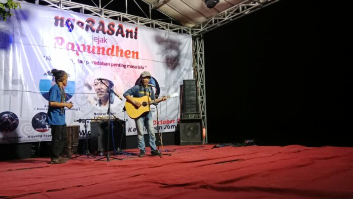 Andik Binjai dan Iwan Dongkel saat tampil bermusik dan bernyanyi pada Peringatan Hari Budaya Nasional Tahun 2025 di Punden Buyut Gantiyah, Watudakon, Kesamben, Jombang, Jumat (17/10). foto: arif yulianto/bhirawa.