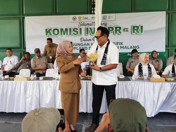 Wabup Malang Hj Lathifah Shohib (kiri) memberikan cinderamata kepada Ketua Rombongan Komisi IV DPR RI H Azikin Solthan (kanan) saat berada di kawasan proyek Upland, Desa Pujon Kidul, Kec Pujon, Kab Malang.