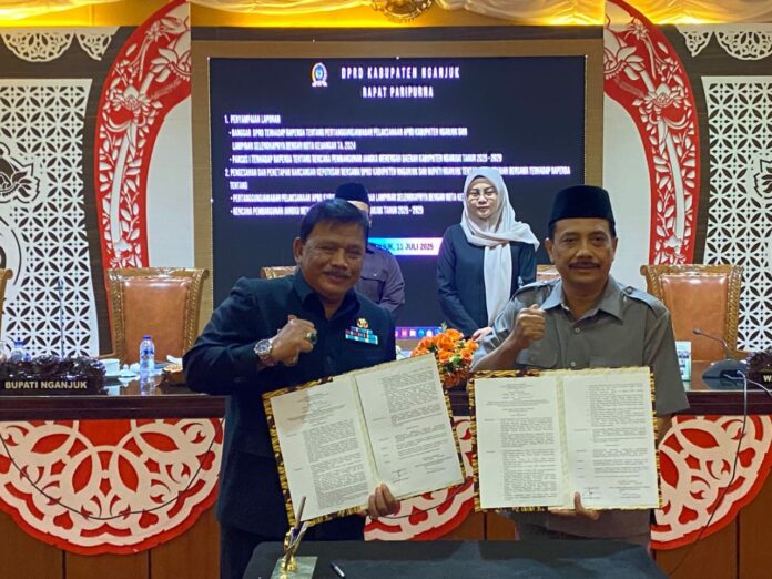 Bupati Nganjuk, Marhaen Djumadi dan Ketua DPRD Nganjuk mengesahkan Raperda, Pertanggungjawaban Pelaksanaan APBD Kabupaten Nganjuk Tahun Anggaran 2024 beserta nota keuangan dan Rencana Pembangunan Jangka menengah Daerah (RPJMD) Kabupaten Nganjuk Tahun 2025–2029, Jumat (11/07/2025).