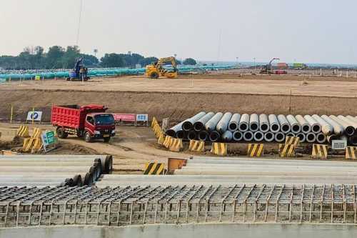 Pengerjaan Tol Semarang-Demak Seksi 1B di Kecamatan Genuk, Semarang, Jawa Tengah, sebagai bagian dari jalan utama yang terintegrasi dengan tanggul laut untuk penanggulangan banjir rob di Semarang dan sekitarnya.