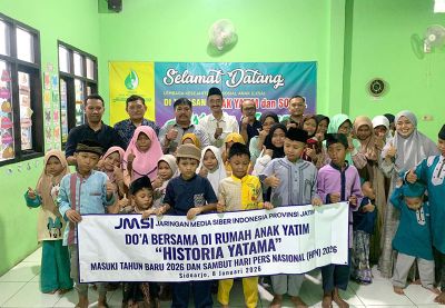 Mengawali tahun baru dan menyambut Hari Pers Nasional (HPN) 2026 pengurus Jaringan Media Siber Indonesia (JMSI) Provinsi Jawa Timur menggelar do’a bersama di rumah anak yatim “Historia Yatama”, Waru Sidoarjo pada Kamis (8/1).