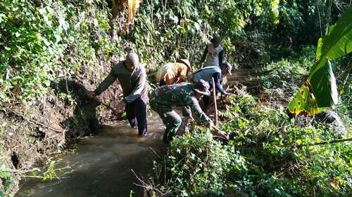 Tercatat sebanyak 15 orang yang terdiri dari personel Koramil, aparat desa, tokoh pemuda, dan para petani setempat melaksanakan kerja bakti membersihkan saluran air.