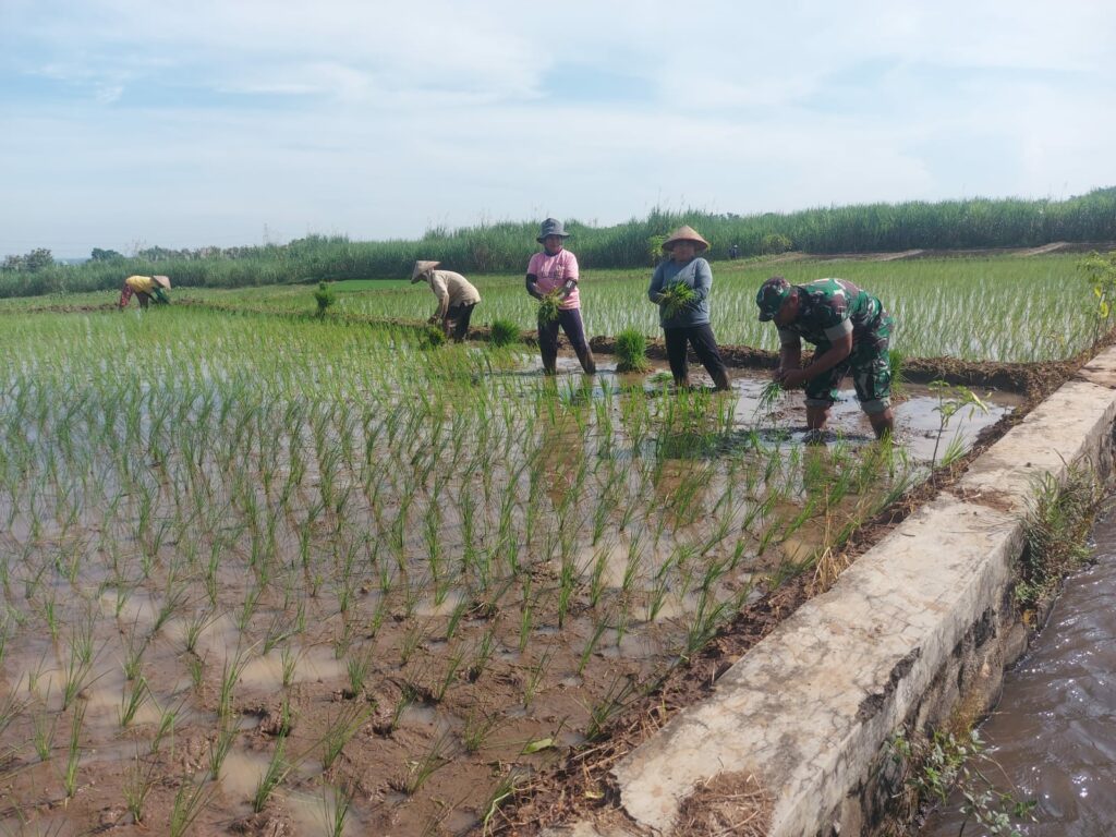 Bintara Pembina Desa (Babinsa) Koramil 0814/16 Bareng, Jombang, Serka Wawan turun langsung ke sawah membantu petani menanam Padi di desa tempatnya bertugas sebagai Babinsa. Tepatnya, di persawahan Dusun Pandansili, Desa Ngampungan, Kecamatan Bareng, Kabupaten Jombang. Kamis (01/05).