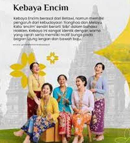 Kebaya merupakan hasil percampuran budaya. Yakni busana bagian atas untuk perempuan. Hingga kini masih menjadi pakaian paling popular di seantero Indonesia, terutama pada etnis Jawa, Sunda, Melayu, dan Bali. Berasal dari kata (qabaya), diduga berasal dari Timur Tengah (jazirah Arab), yang bermakna pakaian jubah. Beberapa bangsa Eropa penjajah (antara lain Portugis) membawa busana Kebaya ke Asia Tenggara.