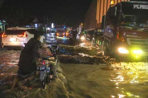 Pantauan di lokasi, Senin (24/11) pukul 22.00 ketinggian air banjir di Jl Raya Tambakrejo yang menghubungkan Surabaya-Banyuwangi sudah mencapai 50 centimeter lebih (mencapai setengah sepeda motor lebih) membuat arus lalin semakin macet.
