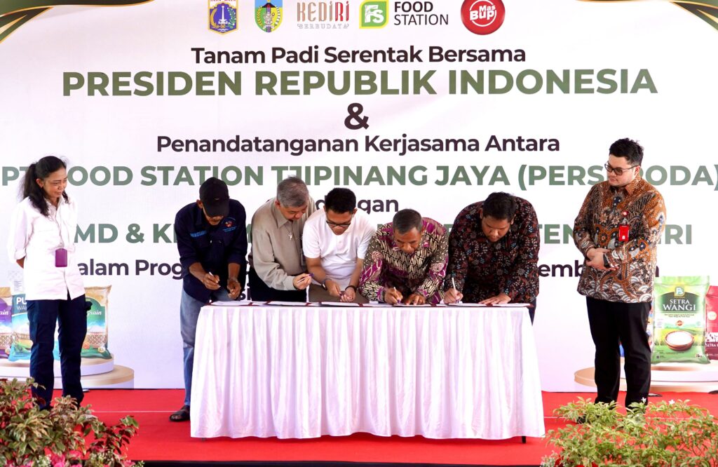 Penandatanganan nota kesepakatan antara perusahaan daerah PT Food Station Tjipinang Jaya (Perseroda) dengan BUMD Canda Birawa dan kelompok tani Kabupaten Kediri di Desa Mekikis, Kecamatan Purwoasri sekaligus tanam padi serentak pada Rabu (23/4/2025) pagi.