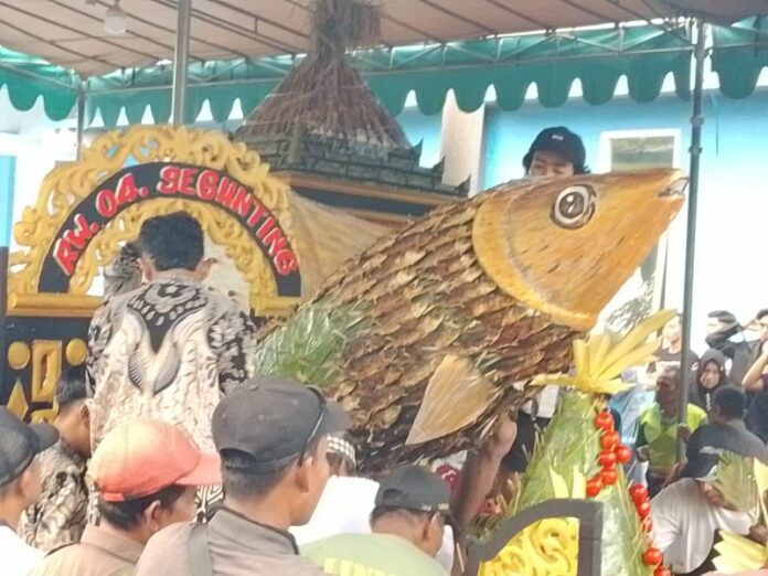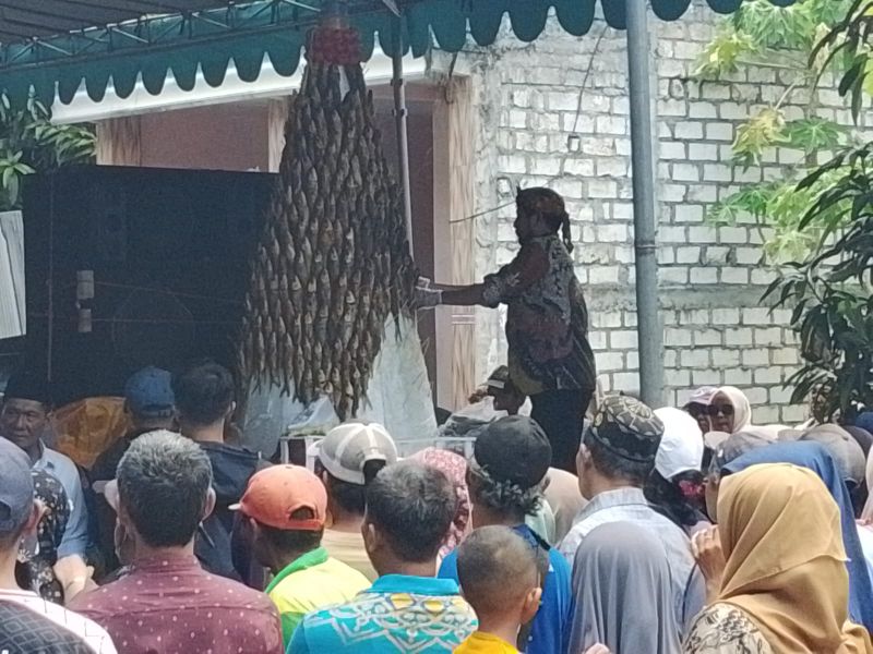 Dengan sabar warga tengah antri untuk mendapatkan pembagian tumpeng bandeng.kerin ikanto/bhirawa