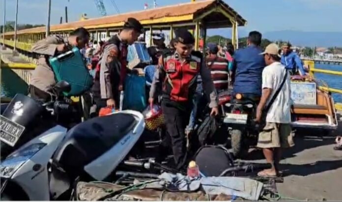 Kasat Samapta Iptu Rachman Fadli Kurniawan bersama anggota Satsamapta Polres Situbondo membantu barang bawaan penumpang saat turun dari kapal di Pelabuhan Jangkar, Jumat (11/7). sawawi/bhirawa