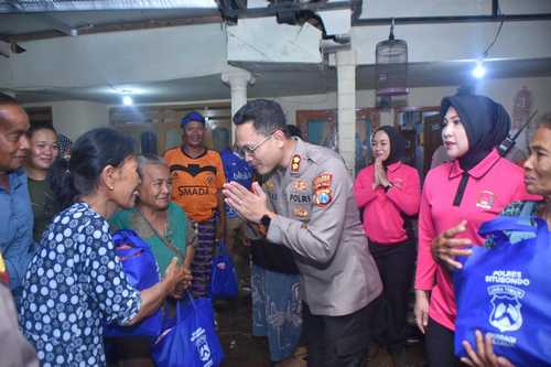 Kehadiran Kapolres Bayu dan Ketua Bhayangkari Cabang Situbondo ini bertujuan untuk menyerahkan bantuan paket sembako sekaligus melihat langsung kondisi pemukiman warga setelah diterjang banjir akibat luapan sungai.
