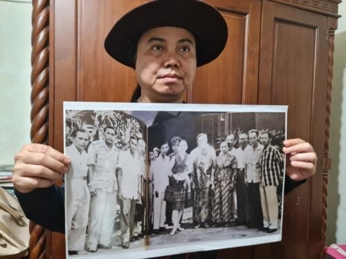 Inisiator Titik Nol Soekarno, Binhad Nurrohmat dengan foto Cindy Adams saat berfoto di Ploso Jombang tahun 1964. foto: arif yulianto/bhirawa.