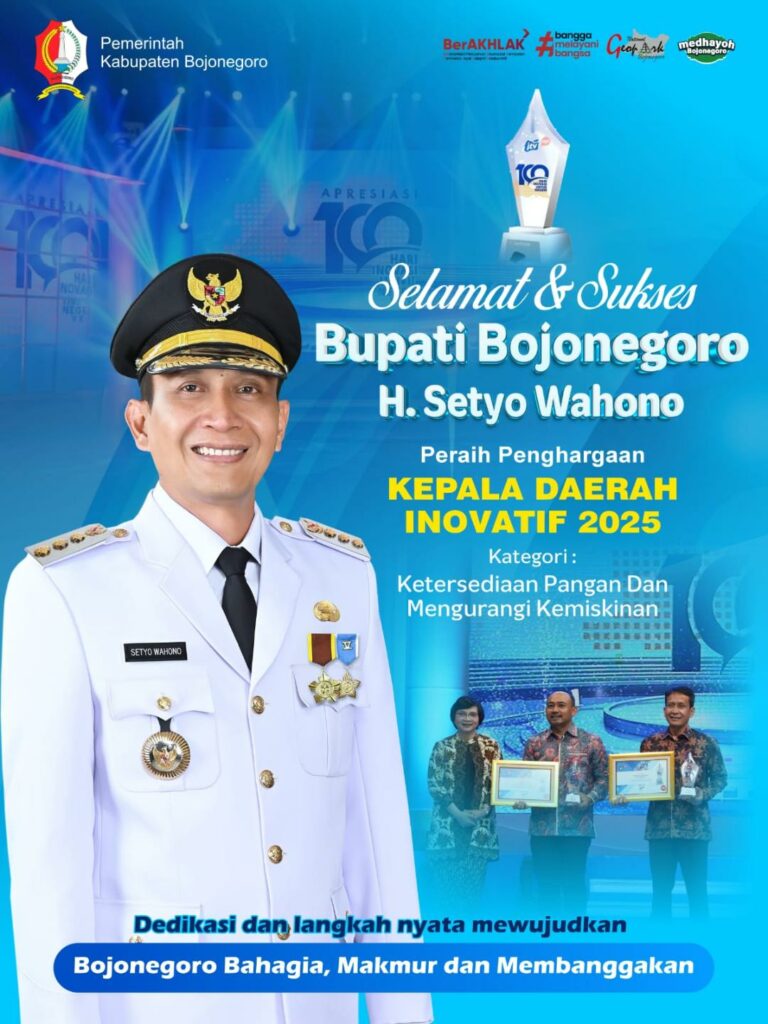 Bupati Bojonegoro, Setyo Wahono, menghadiri malam “Apresiasi 100 Hari Inovasi Untuk Negeri 2025” yang digelar oleh PT JTV di Studio JTV, Kompleks Graha Pena, Jalan Ahmad Yani Surabaya, Selasa (1/7/2025). Dalam acara bergengsi ini, Kabupaten Bojonegoro berhasil meraih penghargaan atas inovasi dan kerja kerasnya dalam 100 hari setelah pelantikan Presiden Prabowo Subianto pada 21 Februari 2025.