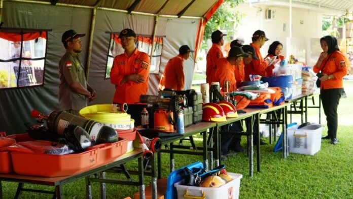 Personel BPBD Kabupaten Kediri ketika menggelar peralatan kebencanaan, Jumat (21/11/2025).
