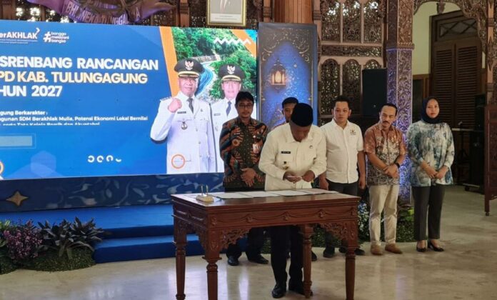 Komitmen ini disampaikan saat membuka Musyawarah Perencanaan Pembangunan (Musrenbang) RKPD Kabupaten Tulungagung Tahun 2027 di Pendopo Kongas Arum Kusumaning Bongso, Kamis (12/3).