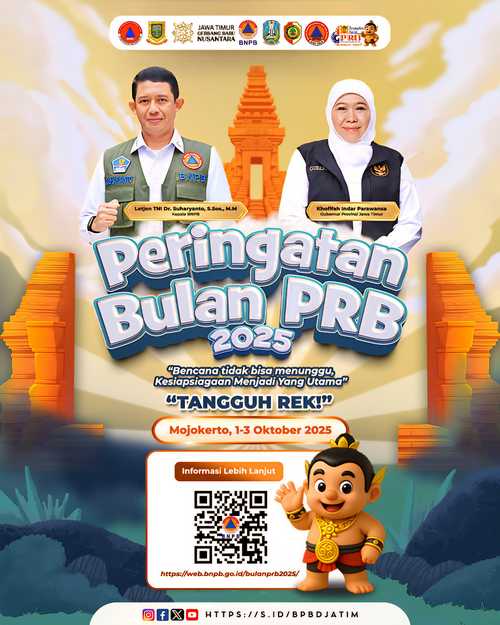Peringatan Bulan Pengurangan Risiko Bencana (PRB) tahun 2025 ini dipusatkan di Mojokerto pada 1-3 Oktober 2025. Event skala nasional ini sekaligus menjadi momen spesial berdirinya Badan Penanggulangan Bencana Daerah (BPBD) Kota Mojokerto.