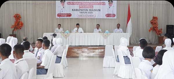 Bupati Madiun H. Hari Wuryanto secara resmi membuka kegiatan Karantina Paskibraka Kabupaten Madiun Tahun 2025 digelar di Icha Orient Tarzan Caruban, Rabu (13/8/2025). Acara dihadiri Sekretaris Daerah, para Asisten, Kepala Perangkat Daerah, Tim Pelatih, Danki/Danton, Pengawal, serta seluruh calon anggota Paskibraka Kabupaten Madiun.