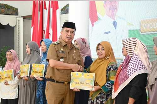 Bupati Madiun, H. Hari Wuryanto, S.H., M.Ak menyerahkan secara simbolis Bantuan Modal Usaha Kepada Masyarakat dan Bantuan Sosial (Bansos) UEP PKH (Usaha Ekonomi Produktif Program Keluarga Harapan) Graduasi TA 2025 di Pendopo Muda Graha, Senin (24/11/2025). Wakil Bupati dr. Purnomo Hadi dan Kepala Dinas Sosial Kab. Madiun Supriyadi juga menyerahkan bansos untuk masyarakat tersebut.