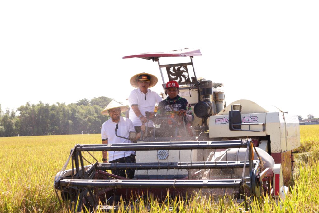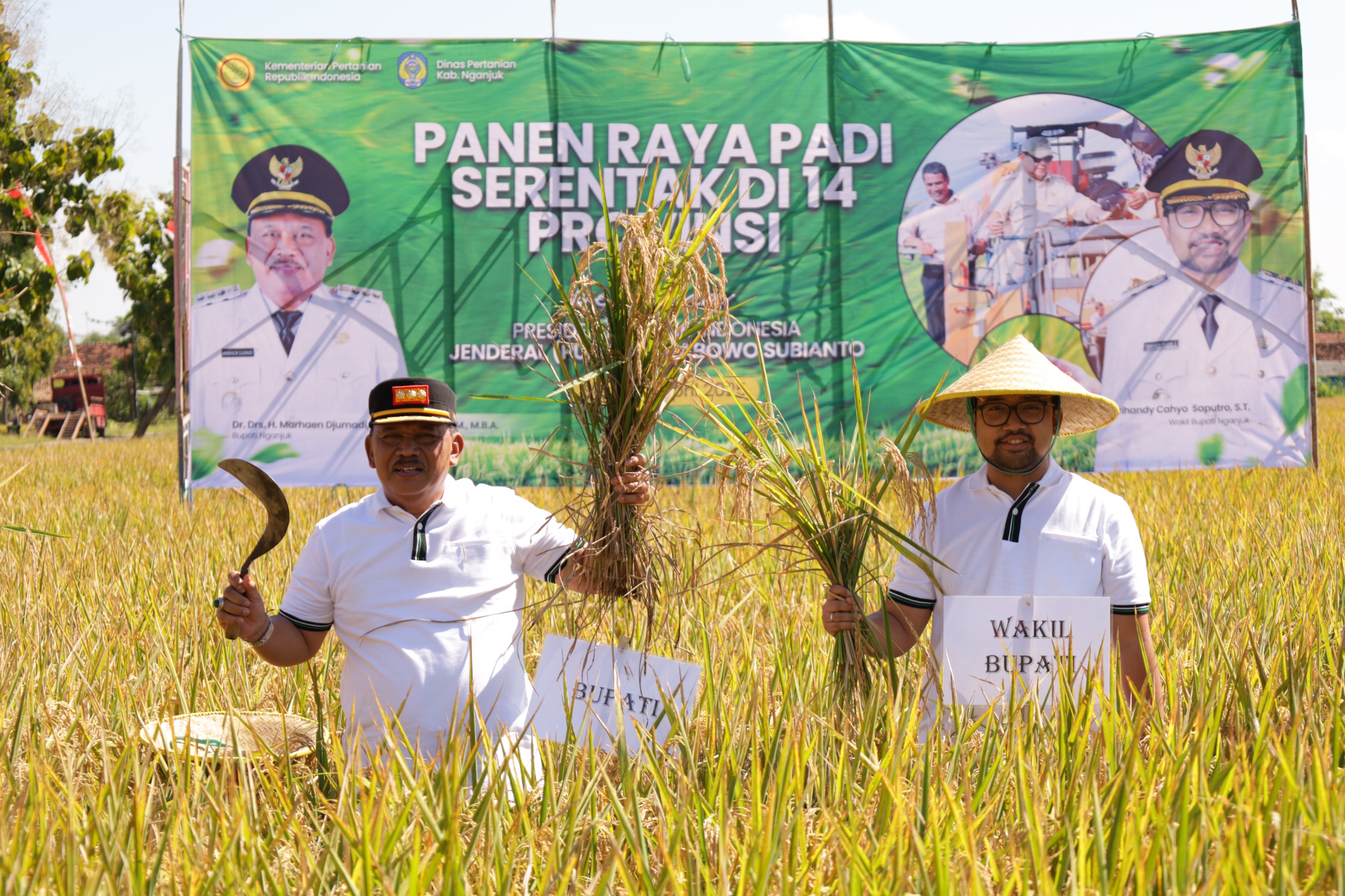 Bupati Nganjuk Marhaen Djumadi dan Wakil Bupati Trihandy Cahyo Saputra melakukan panen serentak di 14 provinsi dan 157 kabupaten/kota di seluruh Indonesia, Senin,(07/04/2025).