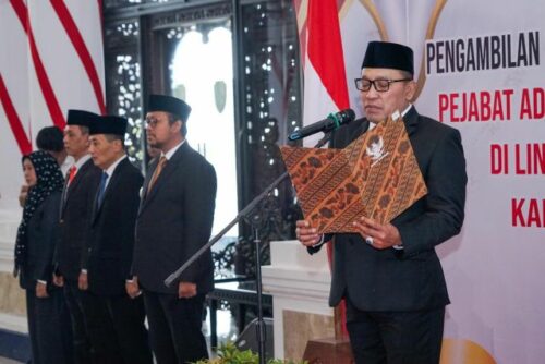 Bupati Sampang H. Slamet Junaidi mengambil sumpah dan melantik 32 pejabat administrator serta pengawas di lingkungan Pemerintah Kabupaten (Pemkab) Sampang. Prosesi pelantikan berlangsung di Pendapa Trunojoyo, Senin (8/9/2025).