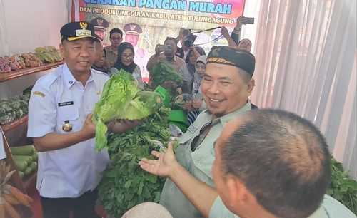 Bupati Tulungagung, Gatut Sunu Wibowo, membagikan sayuran dan buah-buahan pada pengunjung Gerakan Pangan Murah di halaman Kantor Dinas Tanaman Pangan Kabupaten Tulungagung, Rabu (6/8). Pembagian secara cuma-cuma ini dilakukan di stand Dinas Pertanian Kabupaten Tulungagung.