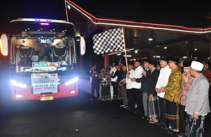 Bupati Gatut Sunu saat memberangkatkan CJH gelombang II asal Tulungagung di Pendopo Kongas Arum Kusumaning Bongso, Rabu (14/5) dini hari.