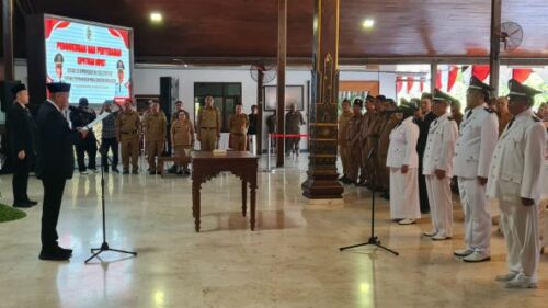 Bupati Gatut Sunu saat melantik empat kepala desa yang sempat purna untuk bertugas kembali selama dua tahun, Senin (25/8) siang.