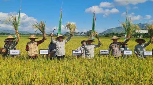Bupati Tulungagung, Gatut Sunu Wibowo, meminta Dinas Pertanian Kabupaten Tulungagung untuk meningkatkan surplus beras saat melakukan panen raya padi bersama Forkopimda Tulungagung di Desa Sanan Kecamatan Pakel, Senin (7/4). Panen raya dilakukan secara serentak di 14 provinsi di Indonesia dengan dipimpin Presiden Prabowo Subianto dari lokasi penen padi di Kabupaten Majalengka, Jawa Barat.
