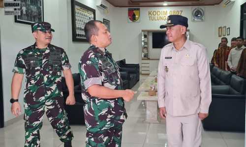 Bupati Tulungagung, Gatut Sunu Wibowo, menyambut kedatangan Ketua Tim Pengawas dan Evaluasi (Wasev) pelaksanaan TNI Mangunggal Membangun Desa (TMMD) ke-123 tahun 2025, Mayjen TNI Herianto Syahputra. Penyambutan bersama anggota Forkopimda Tulungagung itu berlangsung di Makodim 0807 Tulungagung, Kamis (6/3).