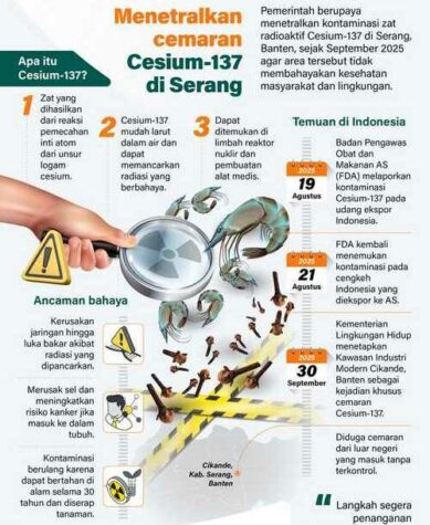 Badan Pengawas Obat dan Makanan Amerika Serikat (Food and Drug Administration, FDA) telah mengeluarkan warning masyarakat di 13 negara bagian. Yakni terhadap udang beku yang di-impor dari Indonesia. Bahkan disebut perusahaan yang memproduksi, PT Bahari Makmur Sejati, dengan label “Great Value Walmart.” Sejak ditemukan (awal September 2025) seluruh produk udang beku dari Indonesia telah ditolak di AS. Diduga kontaminasi terjadi dalam kontainer pengiriman. Walau kontaminasinya rendah (68 Bq per-kiogram).