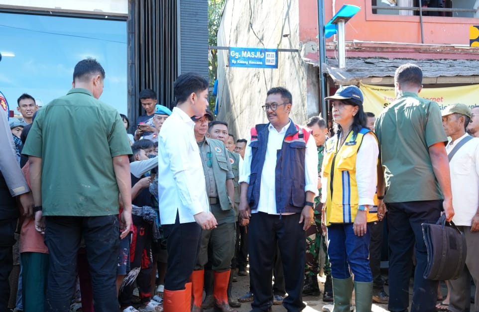 Wakil Presiden Gibran Rakabuming Raka didampingi Wakil Menteri Pekerjaan Umum Diana Kusumastuti meninjau penanganan pascabencana banjir dan longsor di Sukabumi, Jawa Barat, Sabtu (8/3/2025).