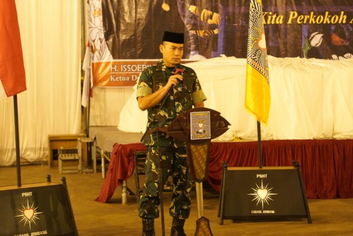 Dandim 0814 Jombang, Letkol Kav Dicky Prasojo saat menghadiri pengesahan warga baru PSHT, Jumat malam (04/07). foto: arif yulianto/bhirawa.