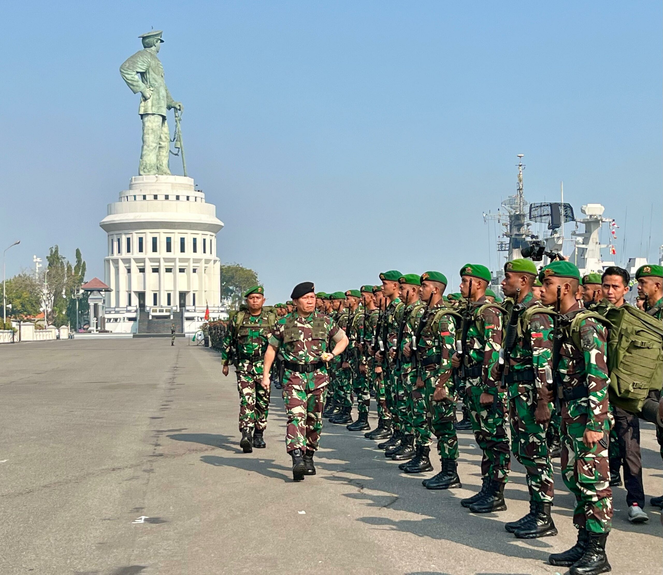 Dangartap III/Surabaya, Mayjen TNI Rafael Granada Baay saat upacara penyambutan Satgas Yonif 527/BY di Dermaga Madura Koarmada II, Ujung Surabaya, Kamis (25/7). foto :Abednego/Bhirawa.