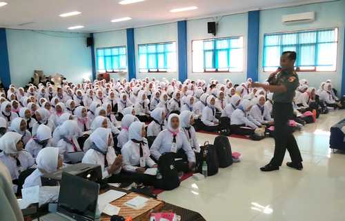 Danramil 0830/09 Gubeng, Mayor Inf Wahyu Liska Krida Basuki memberikan wawasan kebangsaan kepada mahasiswa baru Poltekkes Kemenkes Surabaya, Jurusan Kebidanan, Selasa (8/7).n abednego/bhirawa.