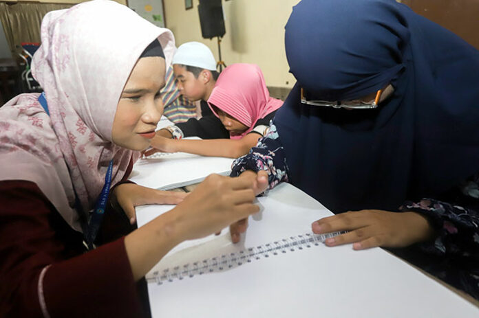 Jari-jari para siswa tunanetra bergerak perlahan menyusuri lembaran Al-Qur’an Braille, mereka membaca bukan dengan mata, melainkan dengan sentuhan, setiap titik timbul pada halaman kitab suci itu diraba dengan penuh konsentrasi, kemudian dilafalkan menjadi ayat-ayat Al-Qur’an yang mengalun pelan dari bibir mereka, proses membaca membutuhkan ketelitian, kesabaran, serta latihan yang tidak sedikit.