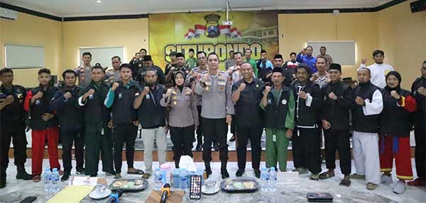 “Ikut hadir juga diantaranya, pengurus IPSI, Tapak Suci, Perisai Diri, Kera Sakti, Naga Putih, GPSKI/Kancil, PSHT, Pamor, Kesatria Mandala, Asad, PPSSA, dan Pagar Nusa dengan jumlah keseluruhan 36 orang,” tutur Kapolres Situbondo AKBP Rezi Dharmawan.