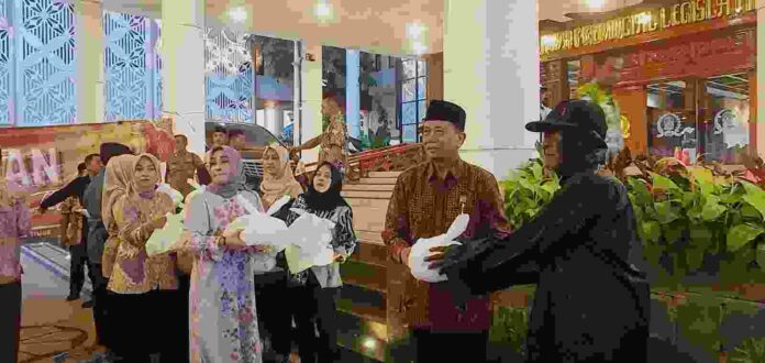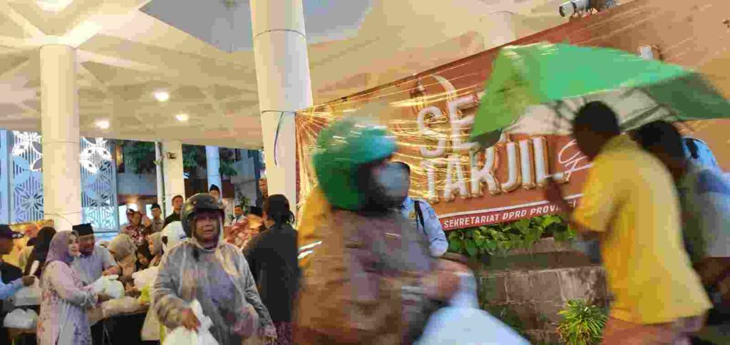 Sekretariat DPRD Jawa Timur membagikan 1.500 paket takjil kepada masyarakat di halaman Kantor DPRD Jatim, Jumat (27/2/2026). Kegiatan tersebut tetap berlangsung meski hujan deras mengguyur kawasan tersebut sejak sore hari.