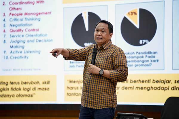 Di hadapan para peserta,nua membawakan materi tentang kepemimpinan transformatif dan birokrasi adaptif sebagai kunci mewujudkan kinerja organisasi pendidikan yang lincah, responsif, dan berorientasi hasil.