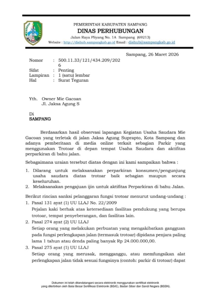 Kepala Bidang (Kabid) Perhubungan Darat, Dinas perhubungan, Kabupaten Sampang, Khotib, saat dikonfirmasi membenarkan adanya surat teguran dari Dishub Sampang tersebut pada owner me Gacoan, salah satu isinya jika konsumen atau pelanggan menggunakan trotoar, sebagian bahu jalan atau seluruh jalan, pihak Gacoan harus mengajukan ijin Senin (30/3/26).
