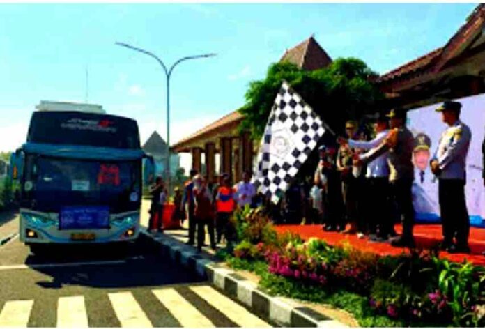 Bupati Sidoarjo Subandi bersama anggota forkopimda Sidoarjo ketika memberangkatkan pemudik gratis di alun-alun Sidoarjo.n alikus/bhirawa.
