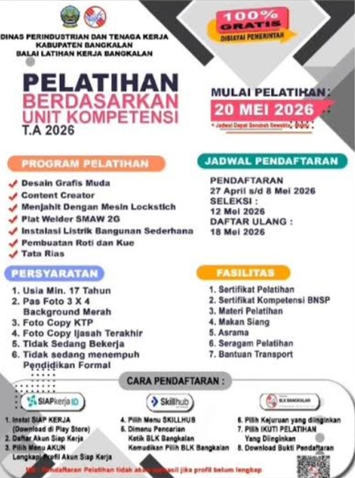 Dinas Perindustrian dan Tenaga Kerja (Disnakerin), Kabupaten Bangkalan melalui Balai Latihan Kerja (BLK) Bangkalan resmi membuka Pelatihan Berdasarkan Unit Kompetensi Tahun Anggaran 2026.