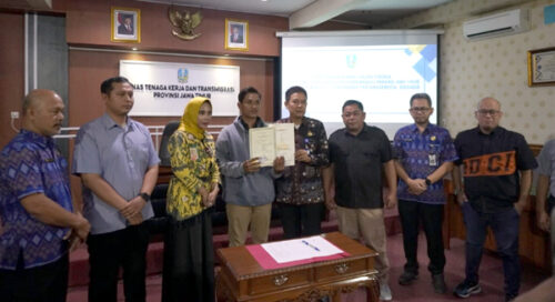 Penyerahan dokumen penting ini dilaksanakan secara resmi pada Kamis (5/6/2025) di Ruang Utama 2 kantor Disnakertrans Prov Jatim, Surabaya.